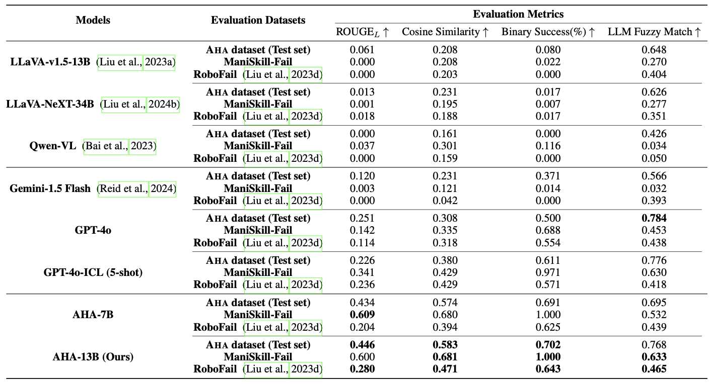 AHA-13B Outperforms 6 SoTA VLMs in Failure reasoning for robotic manipulation Across 3 diverse datasets and 4 evaluation metrics.